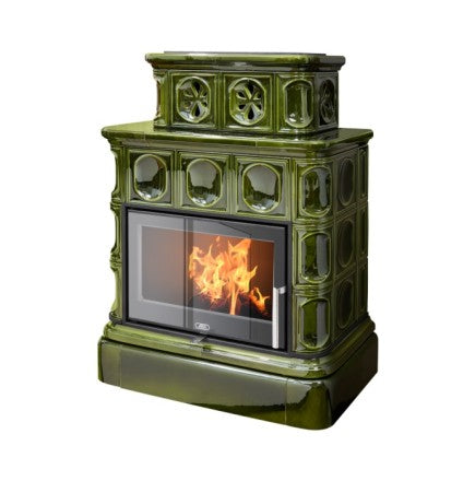Soba de teracotă exclusivă Karelia, cu bază placată cu faianță, conține un insert din oțel.