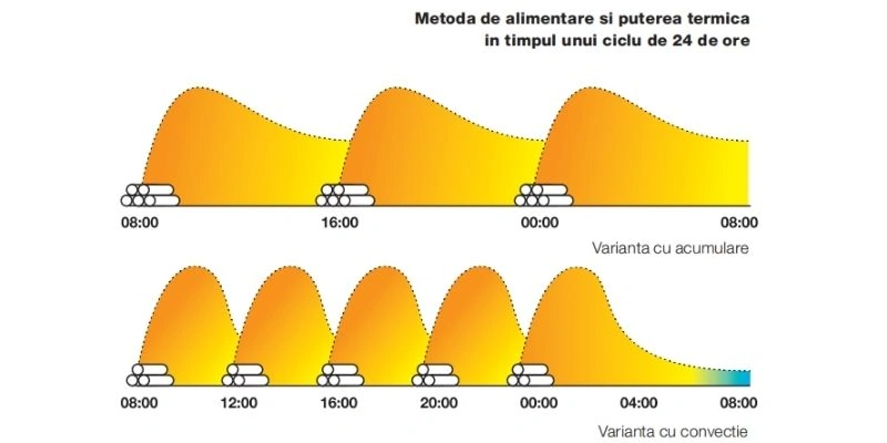 • Incalzire prin acumulare – pentru stocarea caldurii, care este eliberata treptat pe parcursul a 24 de ore, asigurand o incalzire de lunga durata.