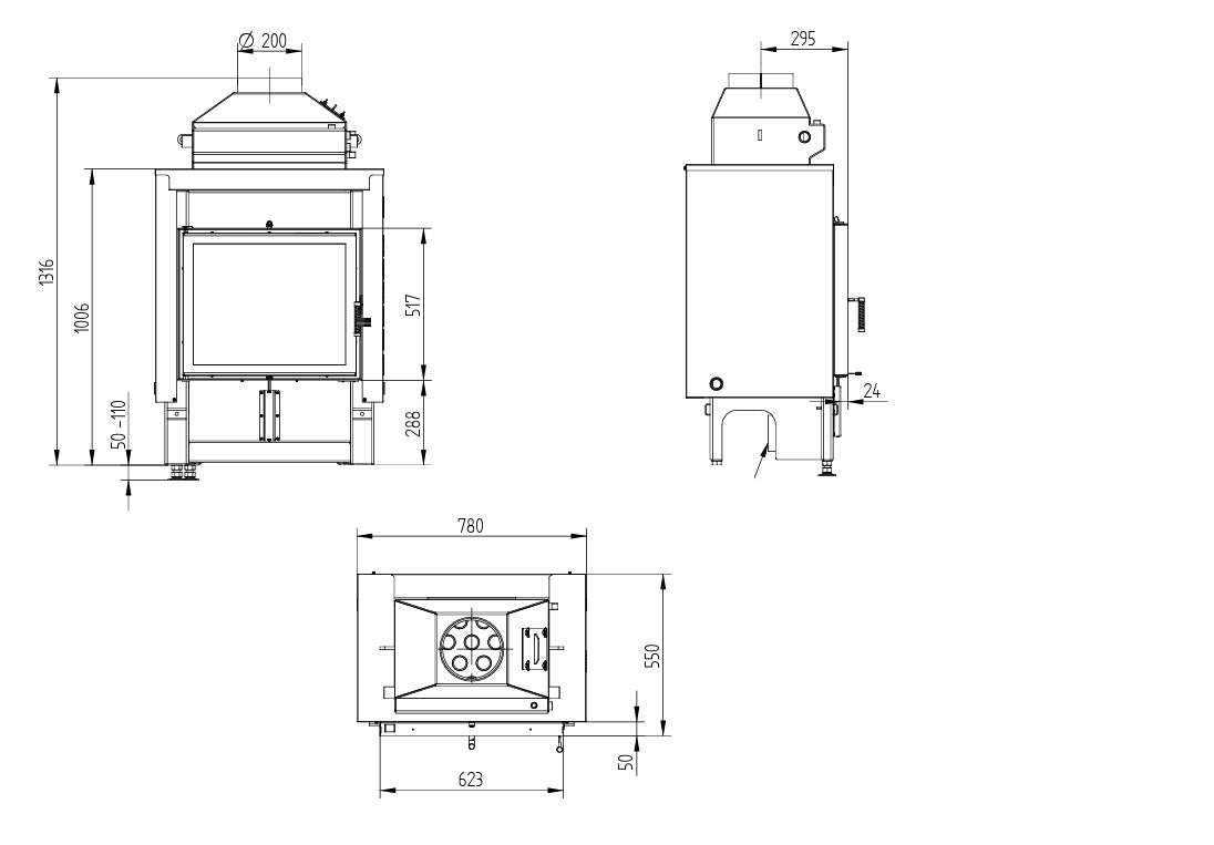 Focarul este echipat cu sticla Schott (Germania) iar la cerere focarele Hoxter pot fi echipate cu sticla dubla atat pentru modelele standard cat si pentru cele cu 2 laturi de sticla astfel incat caldura sa fie redirectionata mai putin pe sticla si mai mult pe partea de distributie, in anumite cazuri influentand randamentul si consumul de lemne.