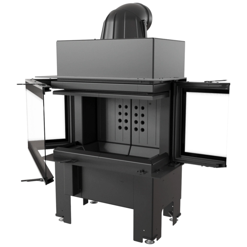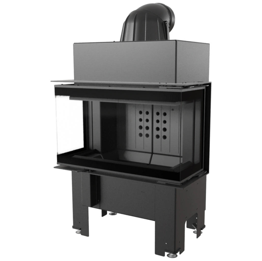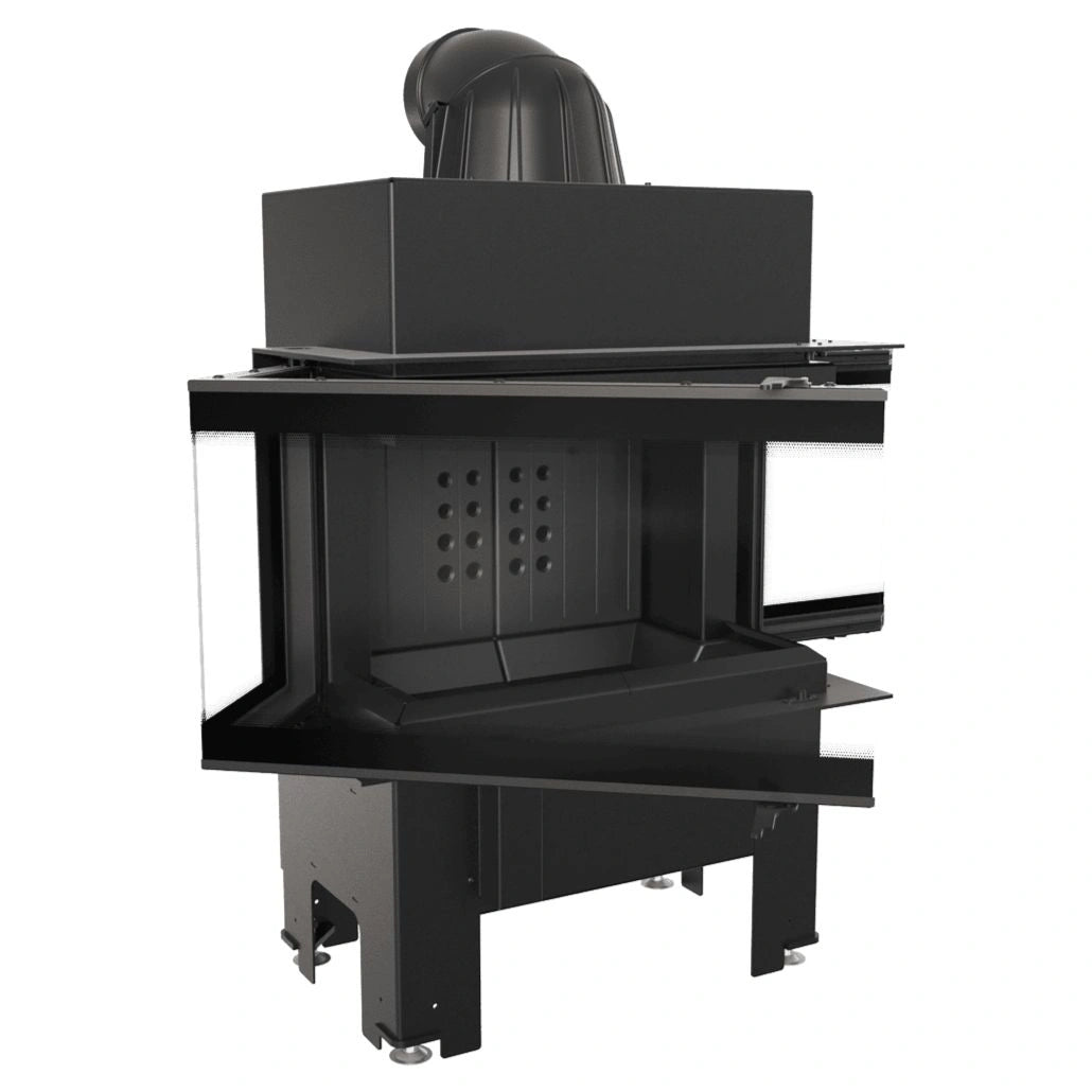 Focar cu sticla pe trei laturi si samota neagra la interior, ce ofera un design premium , fiind ideal pentru constructia semineelor in stil modern. Focarul este echipat la nivelul conului cu sistem de recuperare a caldurii, compus din tevi orizontale ce preiau din caldura gazelor de evacuare, crescand eficienta acestuia. Focarul nu este pretentios in ceea ce priveste cosul de fum, avand evacuare cu diametru de dimensiune mai mica. Pe conul focarului este amplasata o evacuare reglabile la 360 grade, pentru a facilita racordarea acestuia la cosul de fum.