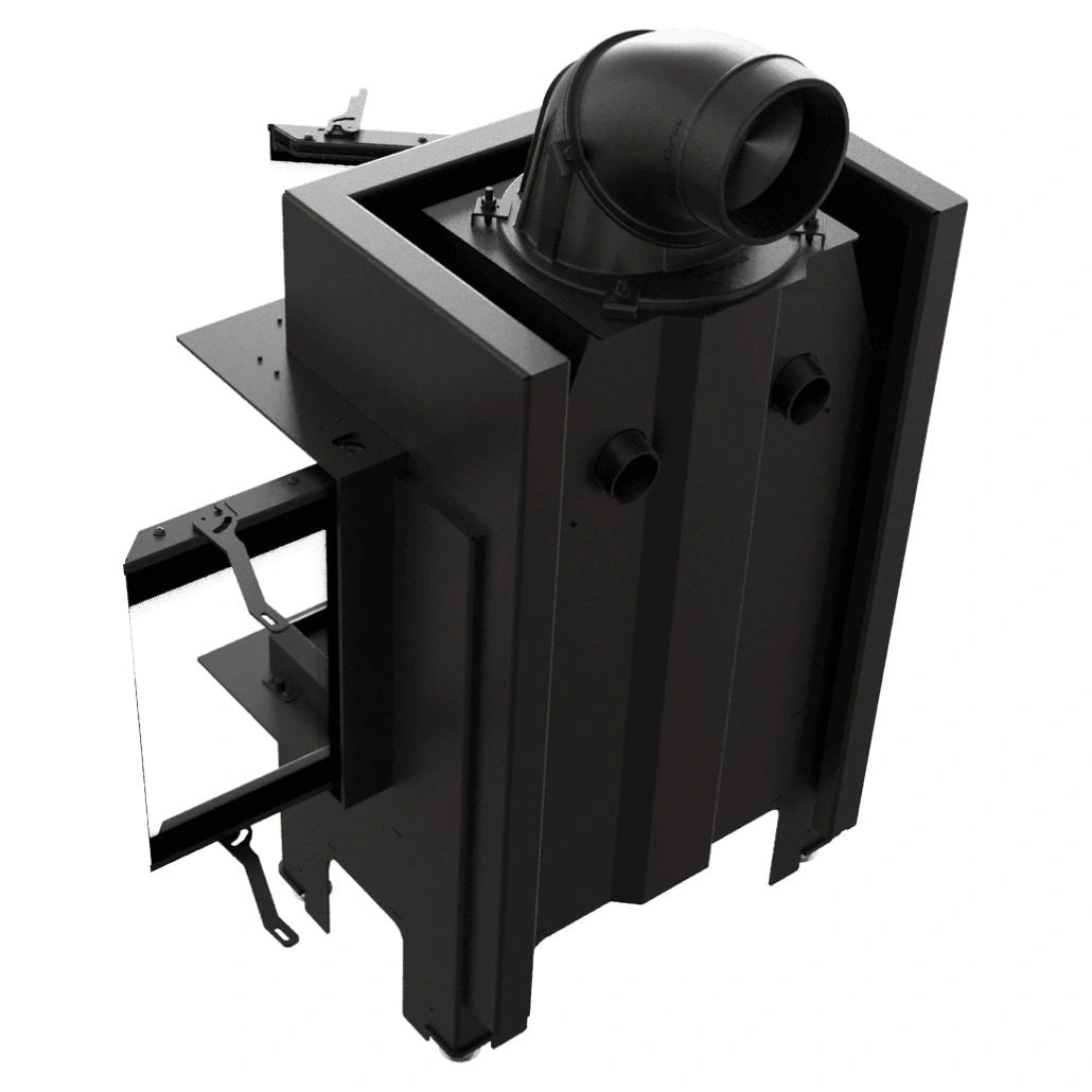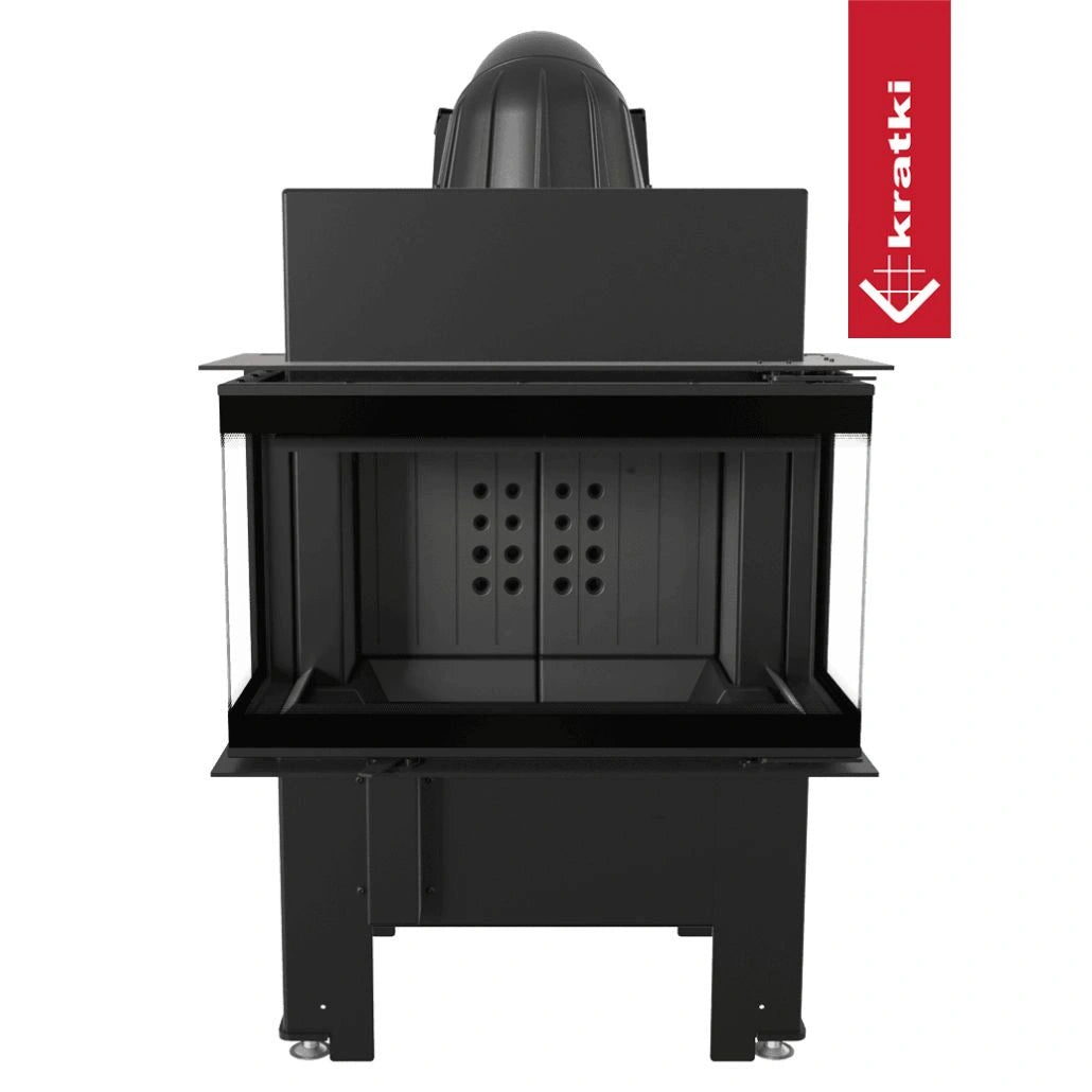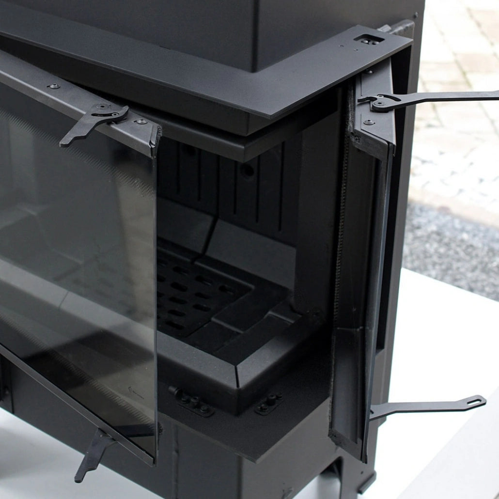 Focar cu sticla pe trei laturi si samota neagra la interior, ce ofera un design premium , fiind ideal pentru constructia semineelor in stil modern. Focarul este echipat la nivelul conului cu sistem de recuperare a caldurii, compus din tevi orizontale ce preiau din caldura gazelor de evacuare, crescand eficienta acestuia. Focarul nu este pretentios in ceea ce priveste cosul de fum, avand evacuare cu diametru de dimensiune mai mica. Pe conul focarului este amplasata o evacuare reglabile la 360 grade, pentru a facilita racordarea acestuia la cosul de fum.
