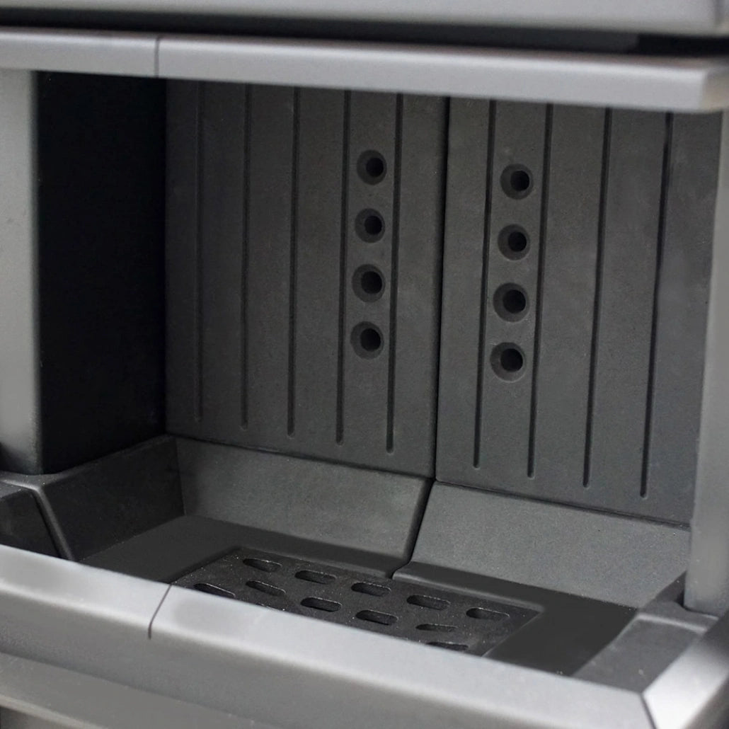 Eficienta procesului de ardere, sticla mai curata si mentinerea temperaturii pentru un timp mai indelungat cu ajutorului captuselii de accumote (samota) din interiorul camerei de ardere.