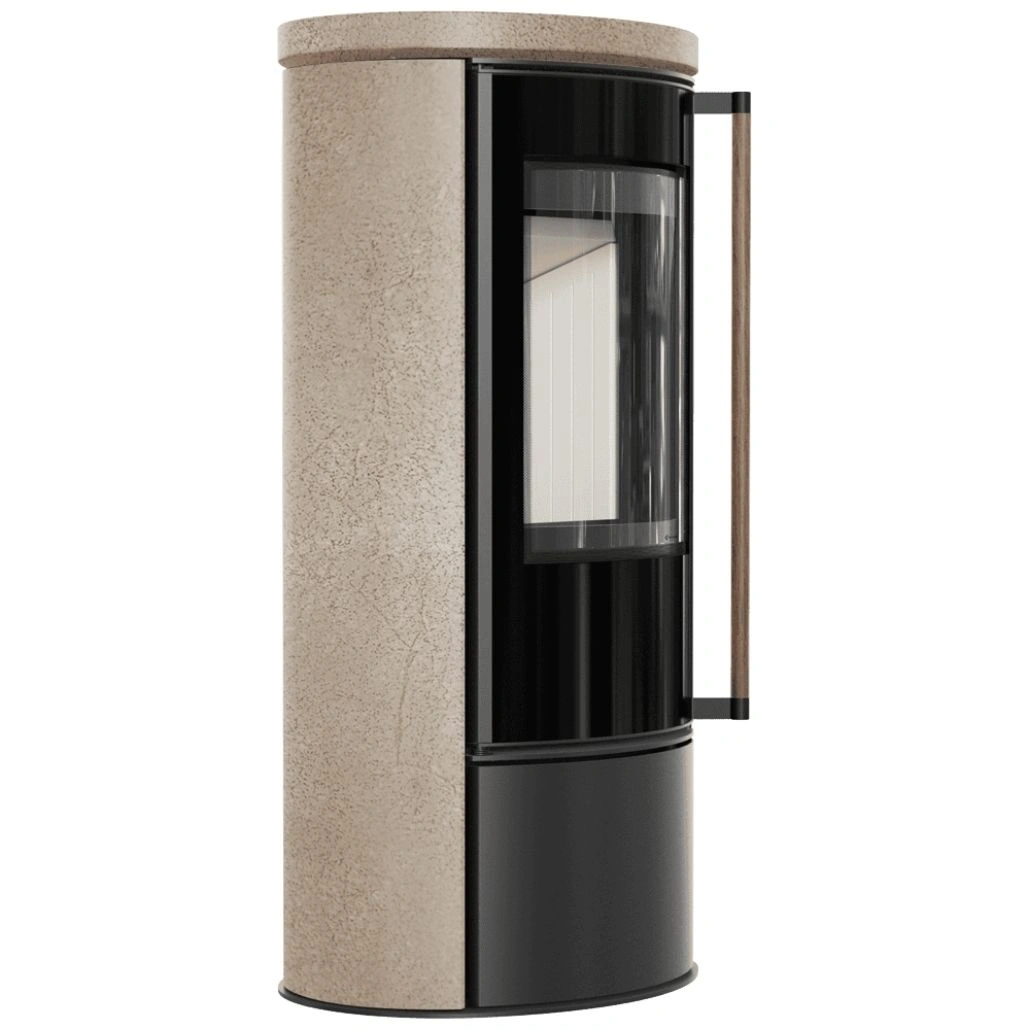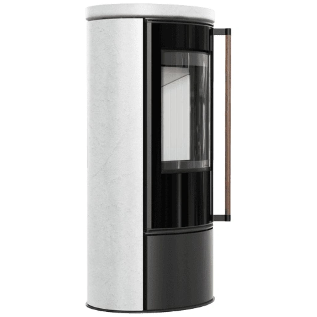 Soba pe lemne cu ceramica decorativa alb natural, capac ceramic si maner din lemn Jatoba ofera ardere curata, eficienta termica ridicata si un design modern construit pe o structura solida din otel.