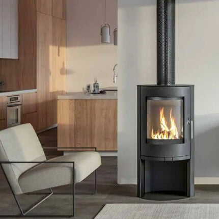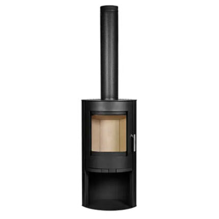 Soba cu lemne Rin are un corp rotund care adaugă o notă contemporană oricărui spațiu. De asemenea, are spațiu de depozitare a lemnului și 6 kW de putere pentru a vă încălzi casa