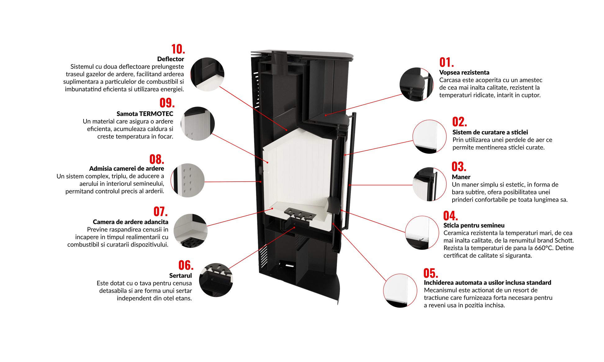 Aceasta soba are componentele cele mai importante realizate din otel, pentru o durata mult mai mare de viata. Este captusita la interior cu samota pentru o ardere cat mai curata si este dotata cu loc de depozitare lemne si tripla combustie.