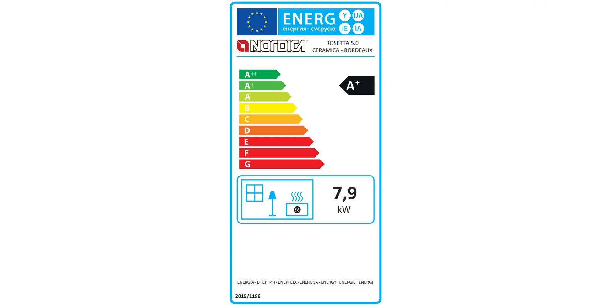 Sobă pe lemne ROSETTA 5.0 Bordeaux, 7.9 kW, ideală pentru încălzirea a până la 226 m³. Cuptor de 28 l, randament 86,9%, consum 2,1 kg/h. Design elegant din ceramică glazurată, cameră de ardere și plită din fontă. Certificată Ecodesign și CE.